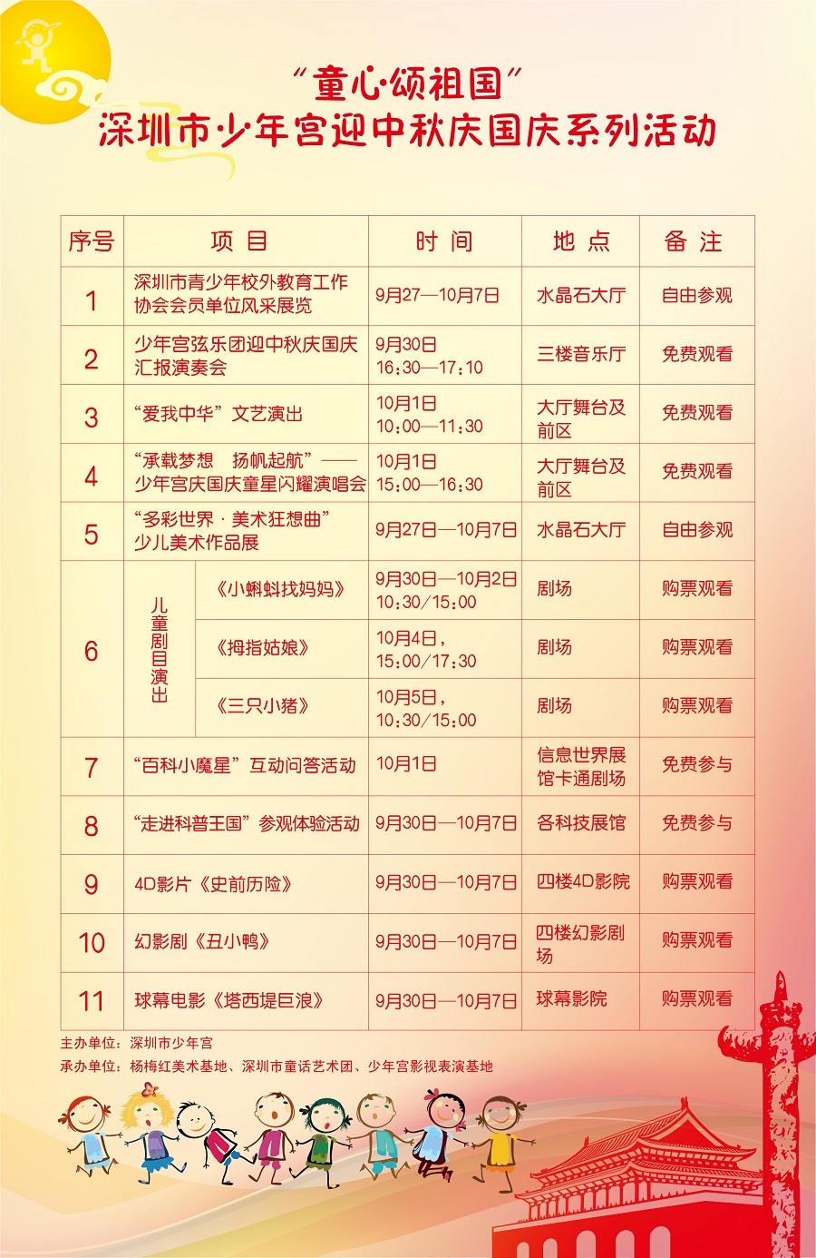 中秋国庆八天长假即将来临,深圳市少年宫将于假期举办“童心颂祖国”——深圳市少年宫迎中秋庆国庆系列活动。精彩的文艺演出、美术展览、科技展馆参观、儿童剧演出等活动将陪伴广大少年儿童度过一个精彩难忘的假期。